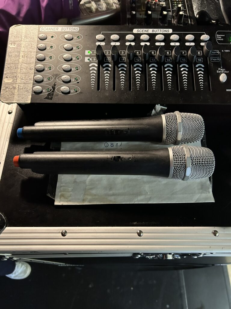 Två stycken trådlösa mikrofoner finns att låna MEN ni behöver själva ta med batterier. Varje mikrofon kräver två st. AA batterier.